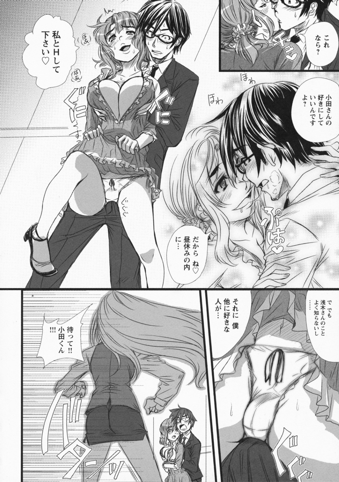 【エロ漫画】男を取り合って誘惑しちゃう淫乱OLたち…誘惑して手マンをされて生ハメ中出しセックスで3Pアクメ堕ちしちゃう【はるるん:0L3P 会議チュウ】