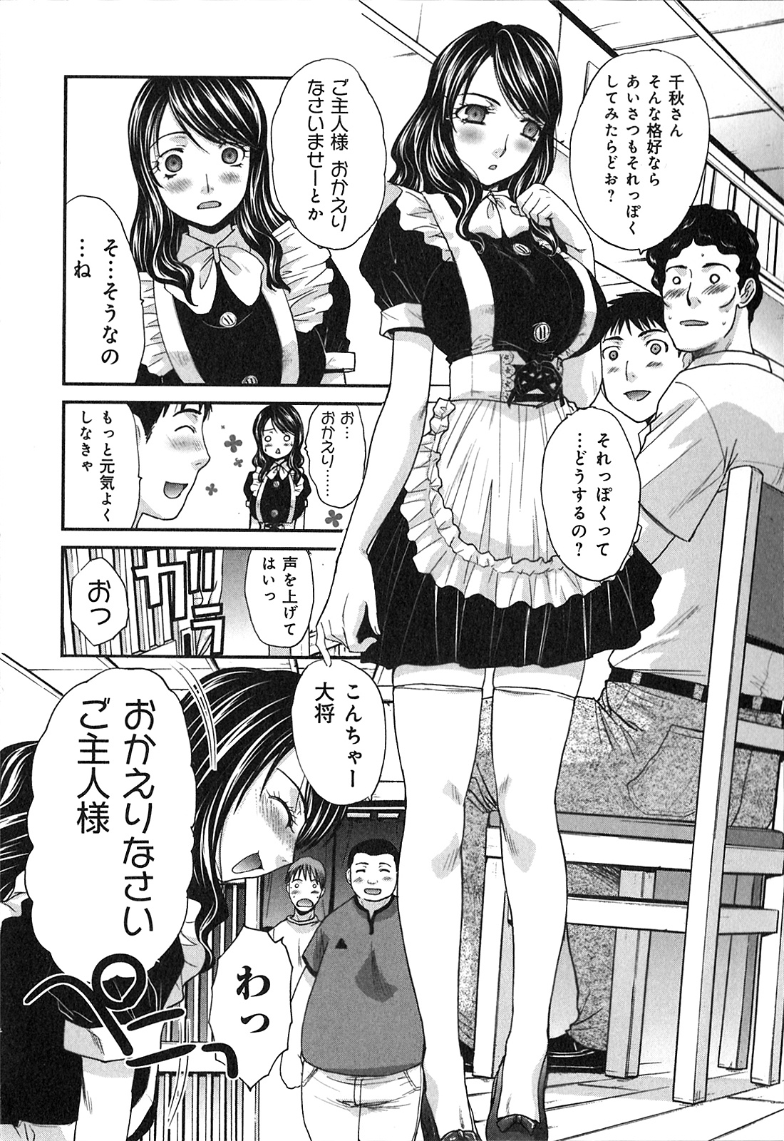 【エロ漫画】メイド服を着て接客しちゃう新婚の若妻…興奮した夫におっぱい揉みをされてトロ顔で生ハメ中出しイチャラブセックスしちゃう【板場広し:ある小料理屋の日常】